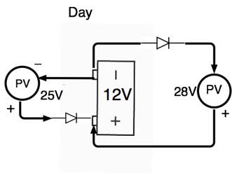 But as you can see the current cannot reverse in the 25V PV because of the diode. They are such useful little devices, so you can use photovoltaic panels of unequal voltage.